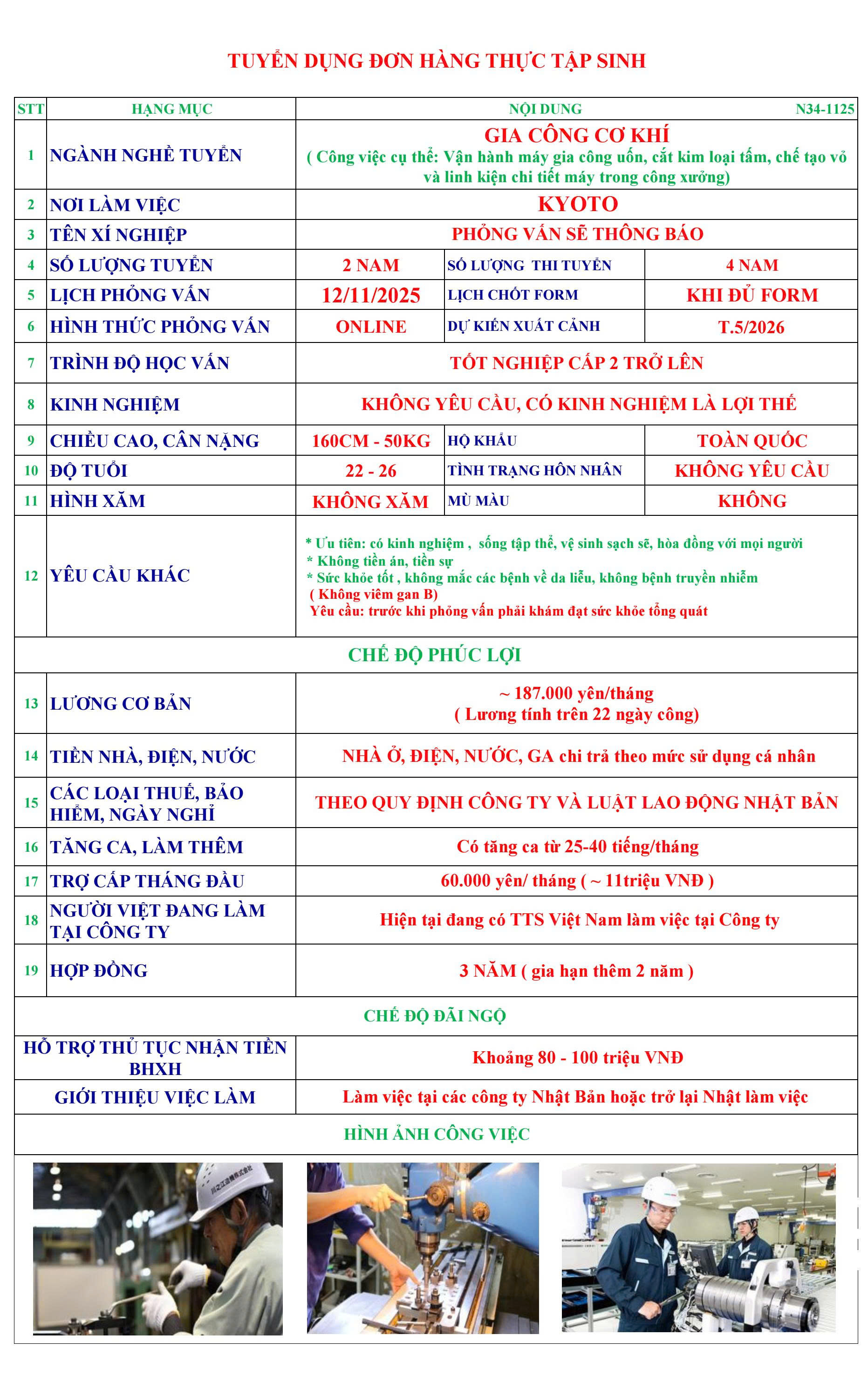| KYOTO| TUYỂN 2 NAM GIA CÔNG CƠ KHÍ VẬN HÀNH MÁY THU NHẬP CAO