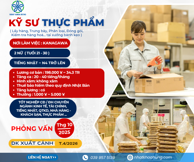 TUYỂN KỸ SƯ THỰC PHẨM TẠI KANAGAWA, LƯƠNG THƯỞNG HẤP DẪN