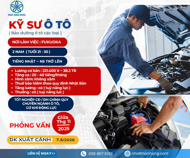 Tuyển gấp 2 nam kỹ sư ô tô làm việc tại Fukuoka, lương hấp dẫn, tăng lương theo năng lực, thưởng có , có tăng ca đầy đủ chế độ phúc lợi.