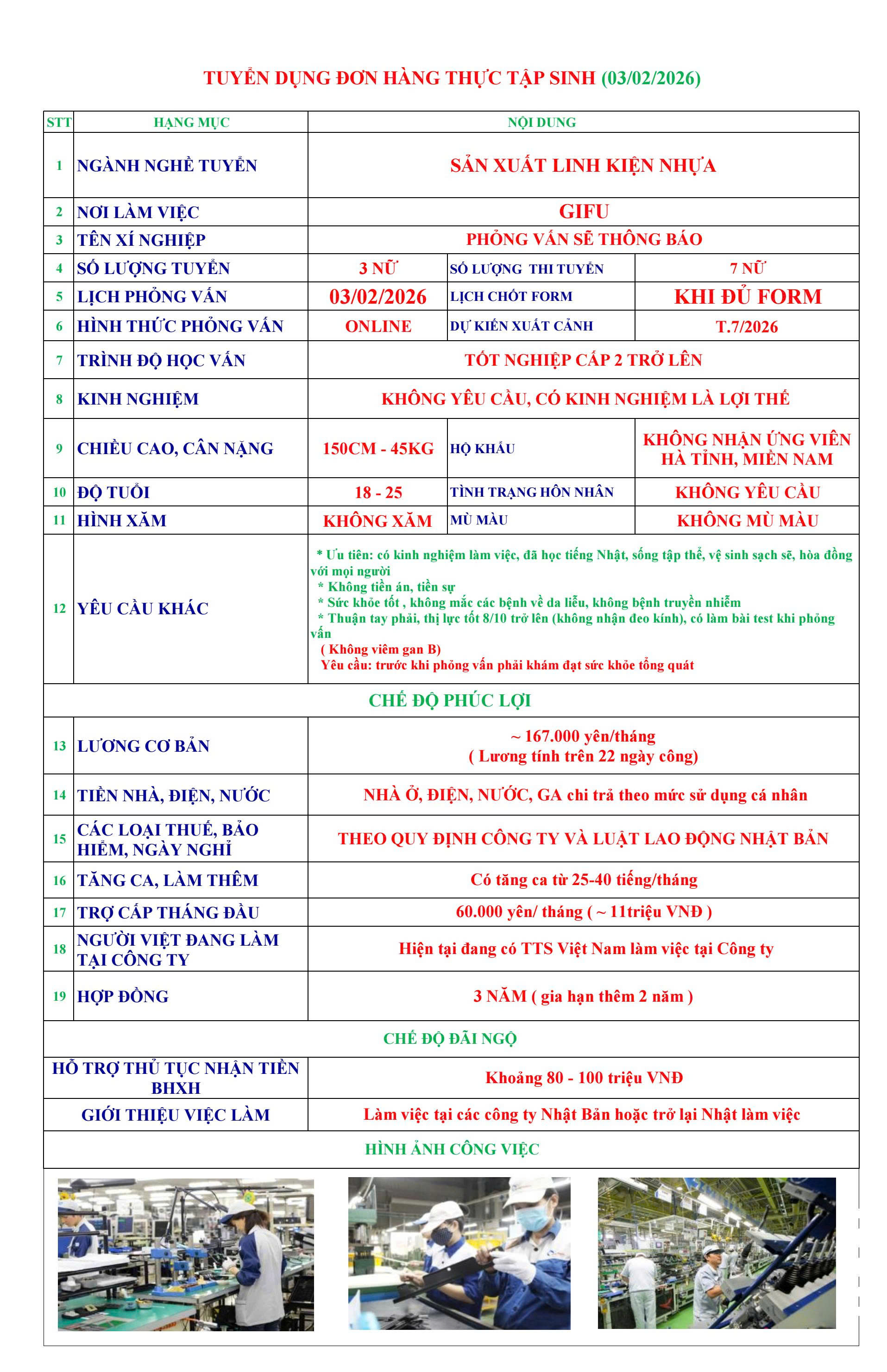 | GIFU | SẢN XUẤT LINH KIỆN NHỰA LÀM VIỆC TRONG NHÀ XƯỞNG THU NHẬP TỐT