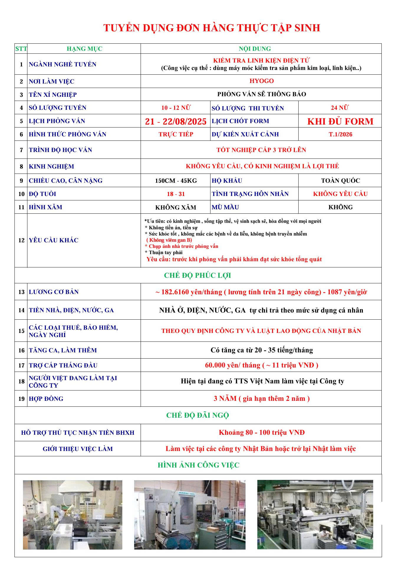 [Hyogo] TUYỂN GẤP 10-12 NỮ KIỂM TRA LINH KIỆN ĐIỆN TỬ