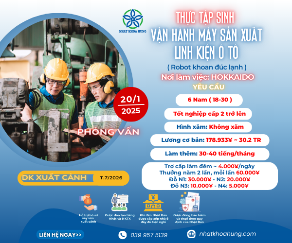 Tuyển gấp vận hành sản xuất linh kiện ô tô, Robot khoan đúc lạnh. Trợ cấp làm thêm, thưởng đầy đủ. Đăng ký ngay nhé!