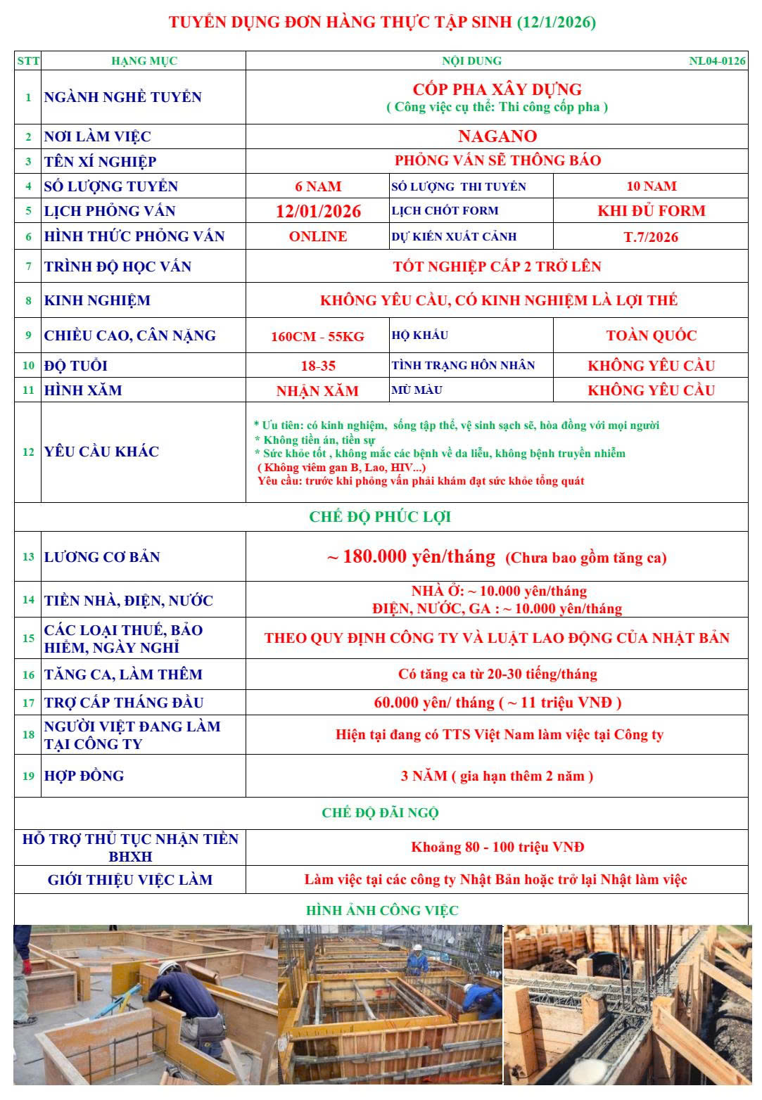 | NAGANO | TUYỂN GẤP 6 NAM THI CÔNG CỐP PHA LÀM VIỆC TẠI NHẬT BẢN