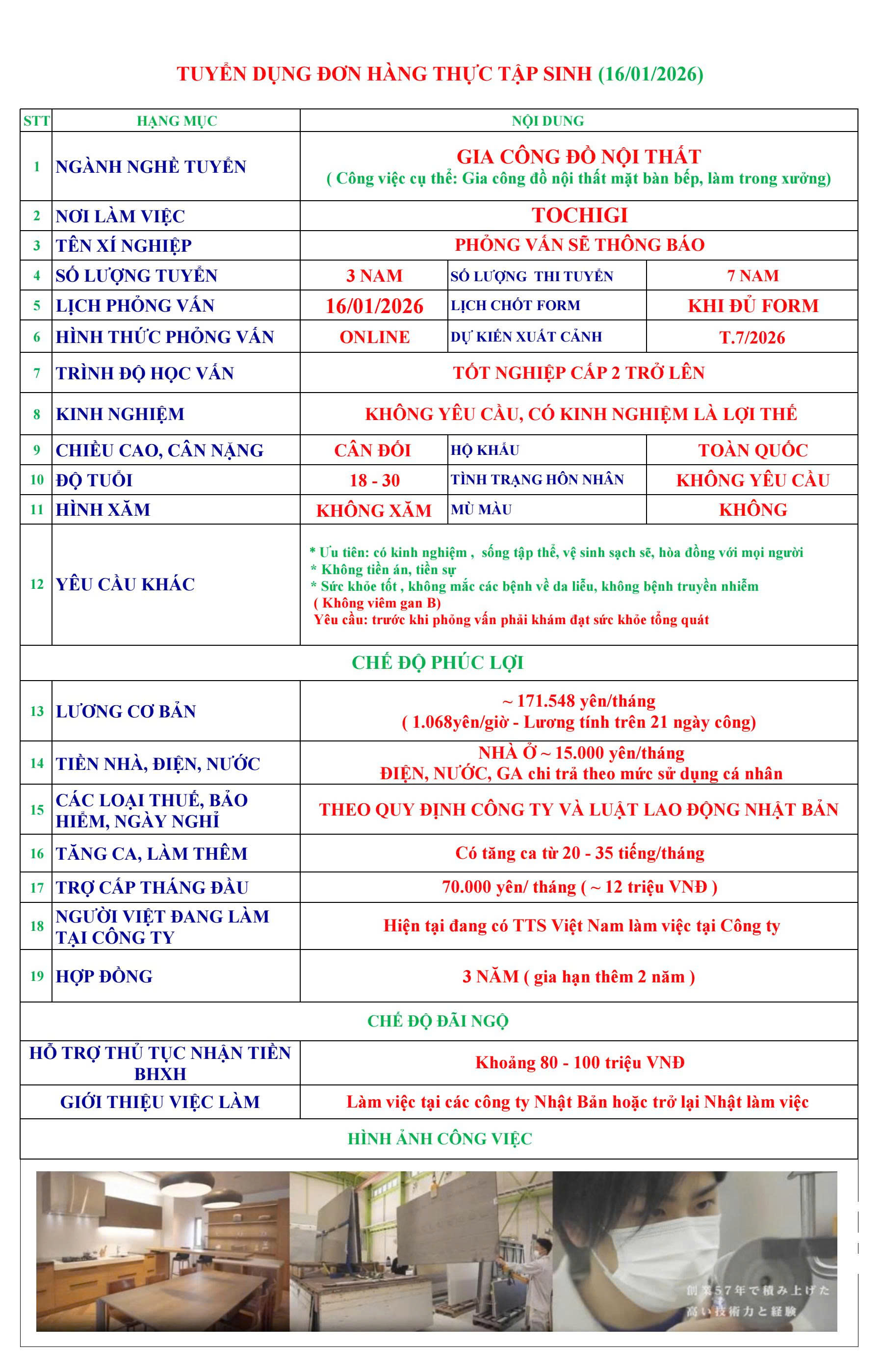 | TOCHIGI | GIA CÔNG ĐỒ NỘI THẤT CẦN TUYỂN 3 NAM LÀM VIỆC TẠI NHẬT BẢN