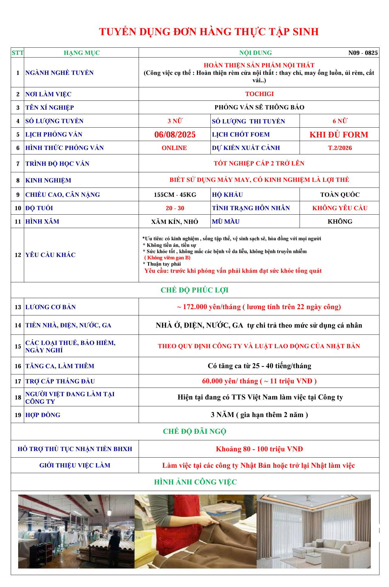 [Tochigi] TUYỂN 3 NỮ HOÀN THIỆN SẢN PHẨM NỘI THẤT TẠI NHẬT BẢN