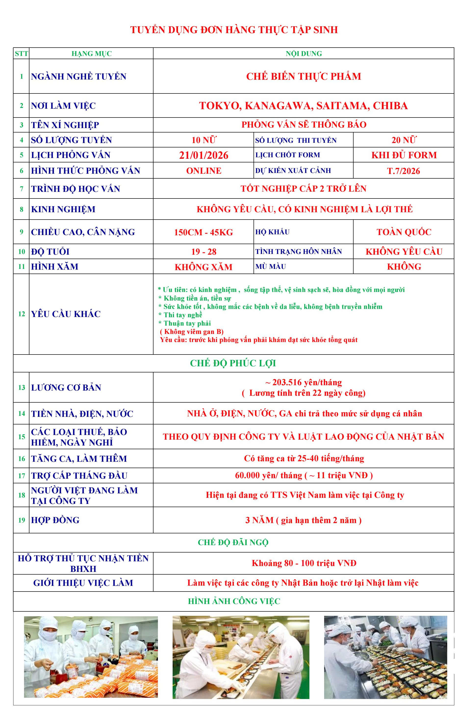 | TOKYO, KANAGAWA, SAITAMA, CHIBA | CHẾ BIẾN THỰC PHẨM LÀM SUSHI, SASHIMI, CƠM HỘP