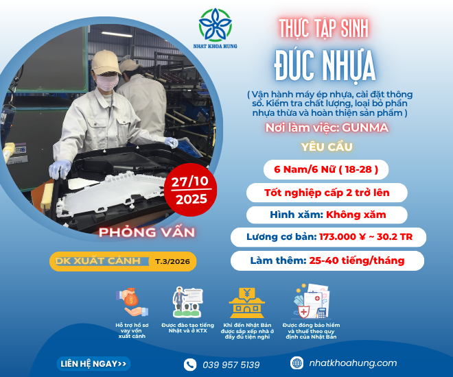 | GUNMA | CẦN TUYỂN 6 NAM/6 NỮ LÀM VIỆC ĐÚC NHỰA TẠI NHẬT BẢN