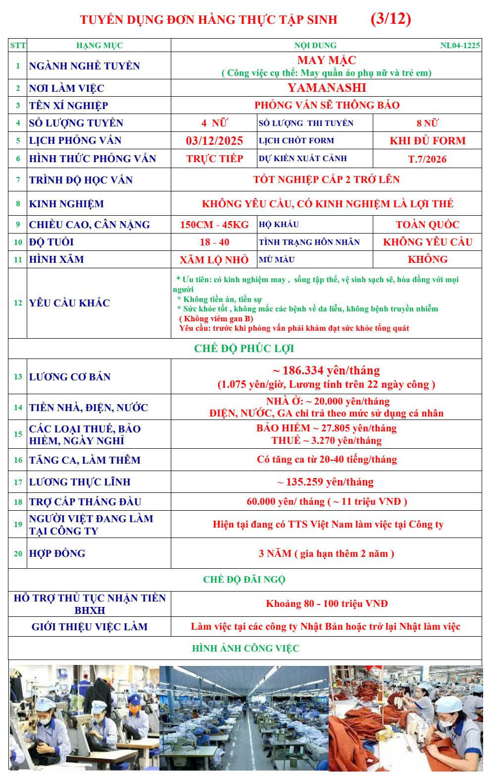 | YAMANASHI | TUYỂN GẤP 4-5 NỮ LÀM MAY MẶC TẠI NHẬT BẢN