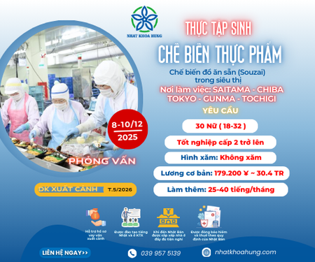 | SAITAMA - CHIBA - TOKYO - GUNMA - TOCHIGI | TUYỂN GẤP 30 NỮ CHẾ BIẾN THỰC PHẨM