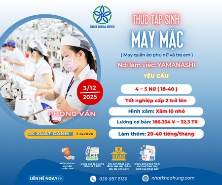 | YAMANASHI | TUYỂN GẤP 4-5 NỮ LÀM MAY MẶC TẠI NHẬT BẢN