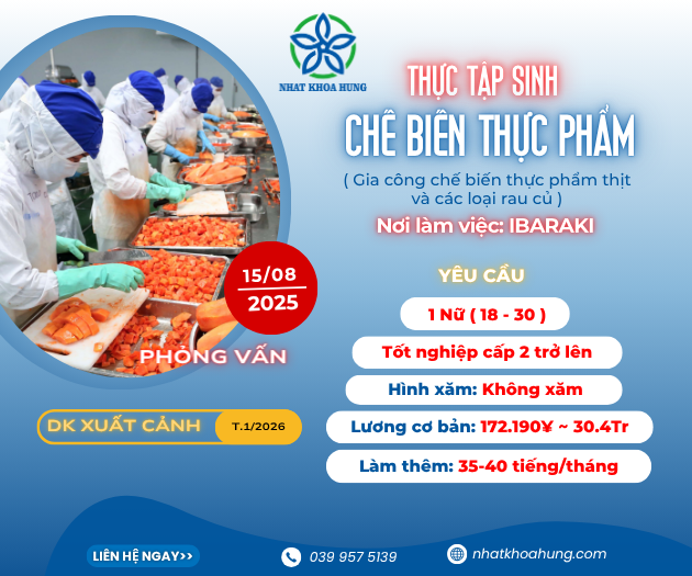[Ibaraki] TUYỂN 1 BẠN NỮ LÀM CHẾ BIẾN THỰC PHẨM LƯƠNG HẤP DẪN